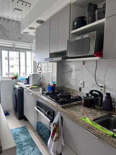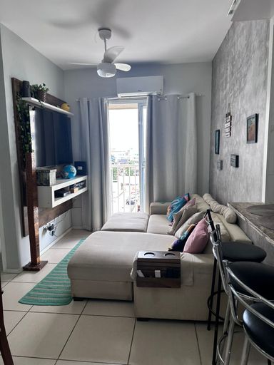 Sala em dois ambientes, varanda, cozinha com área de serviço, banheiro e dois quartos, sendo uma suíte.