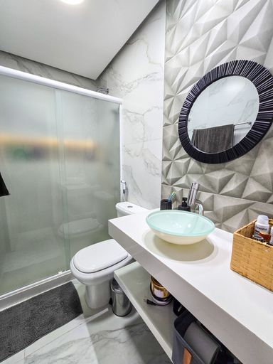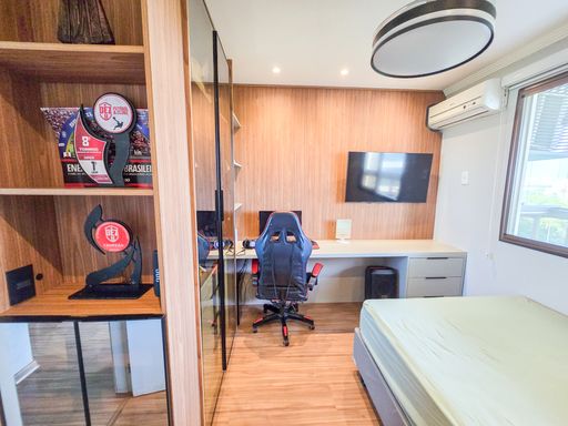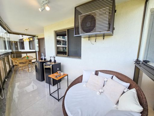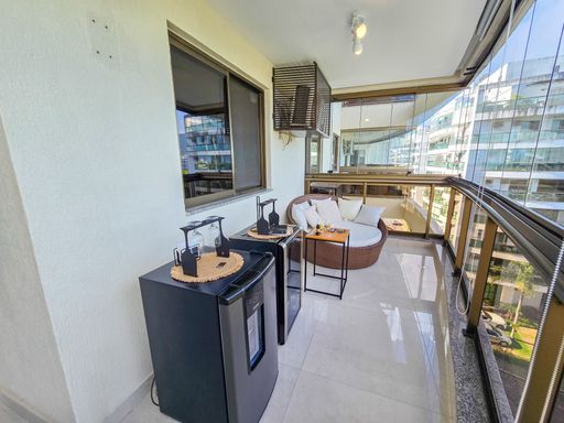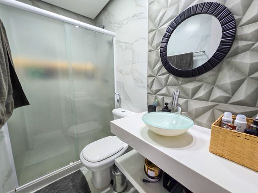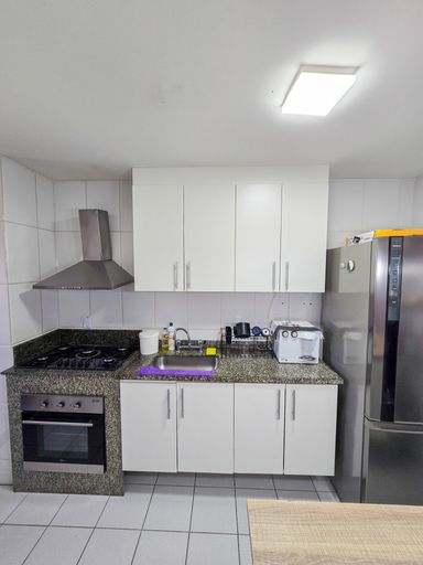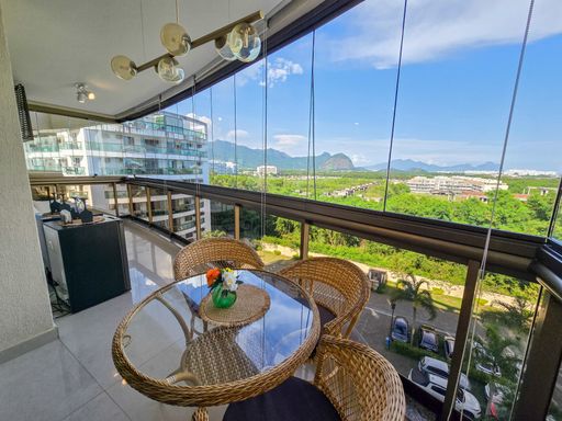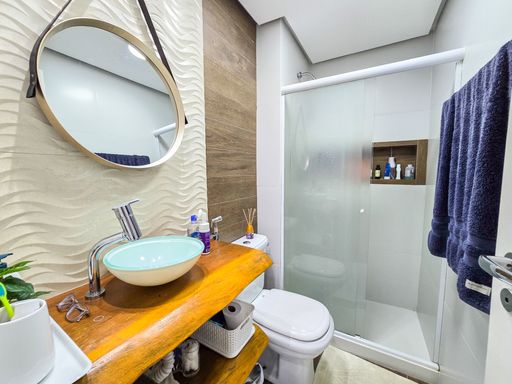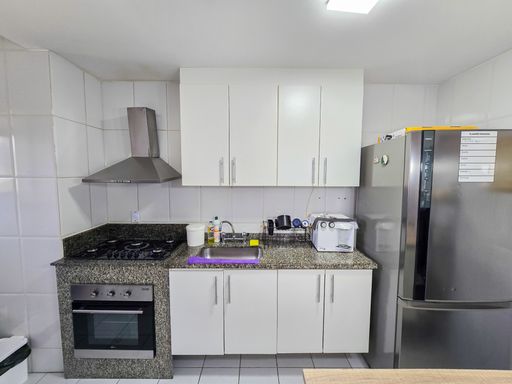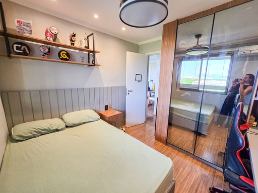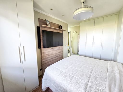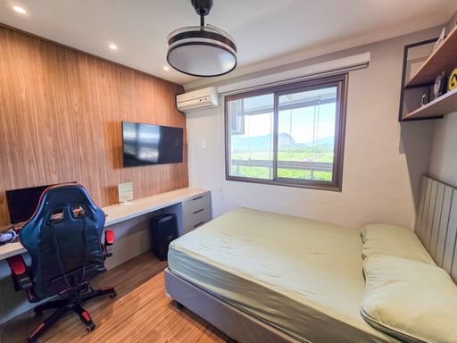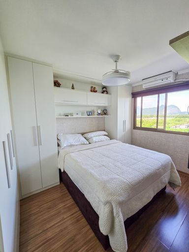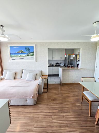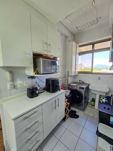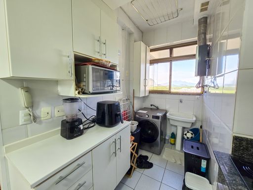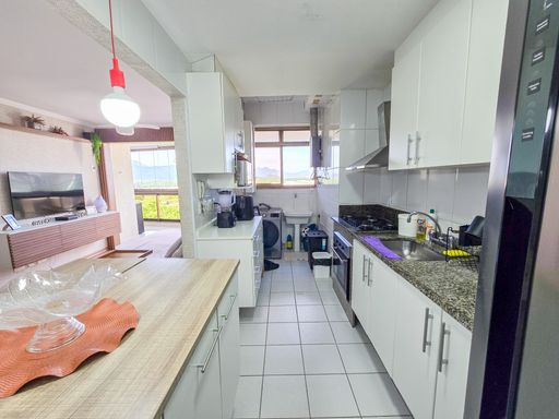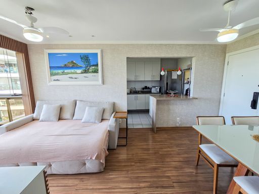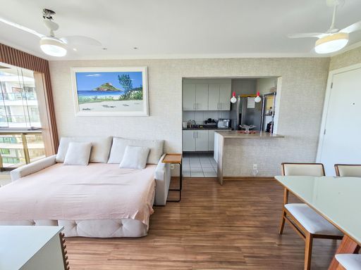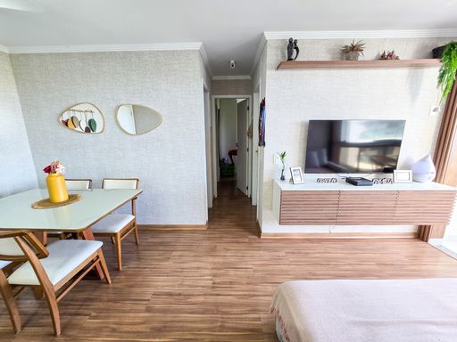 Sala ampla em dois ambientes com varanda integrada, cozinha com área de serviço, banheiro e dois quartos, sendo uma suíte.