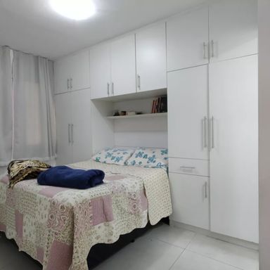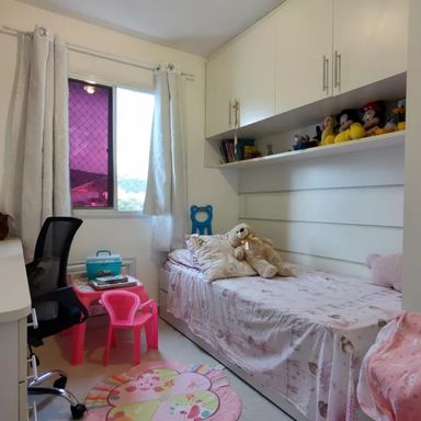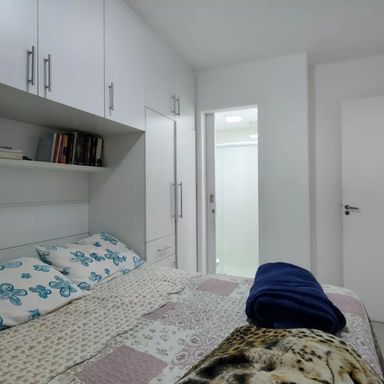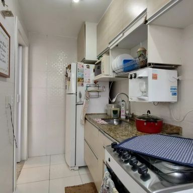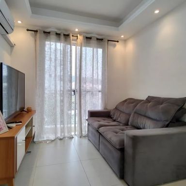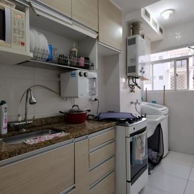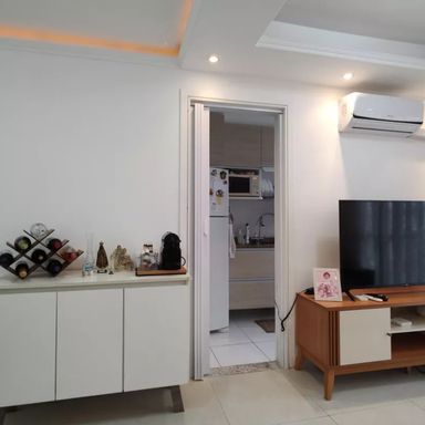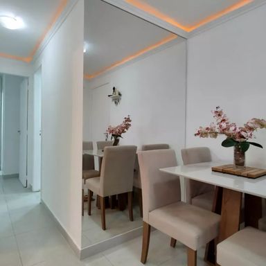 Com 2 quartos, sendo 1 suíte, sala em 2 ambientes com varanda, banheiro social e cozinha com área de serviço.