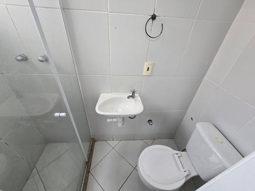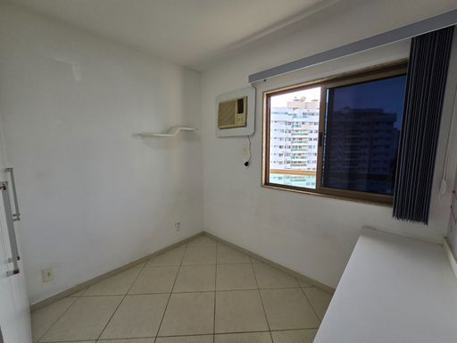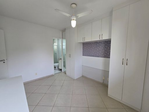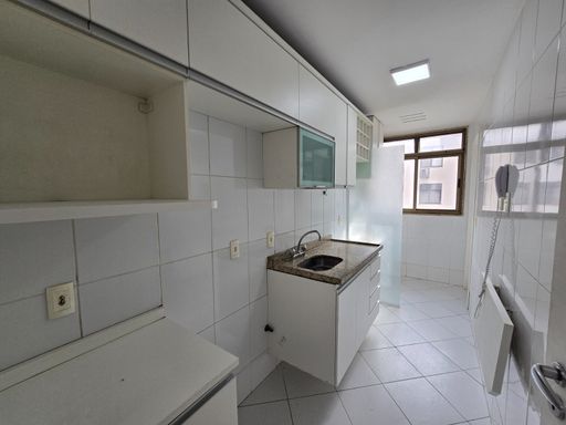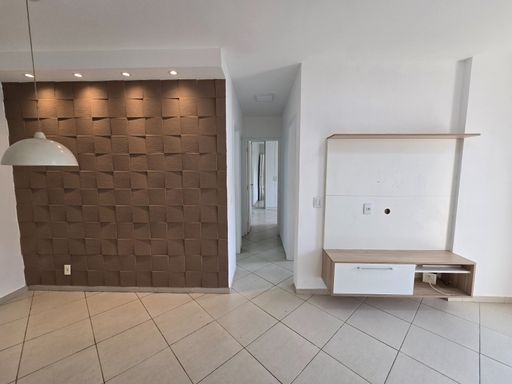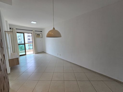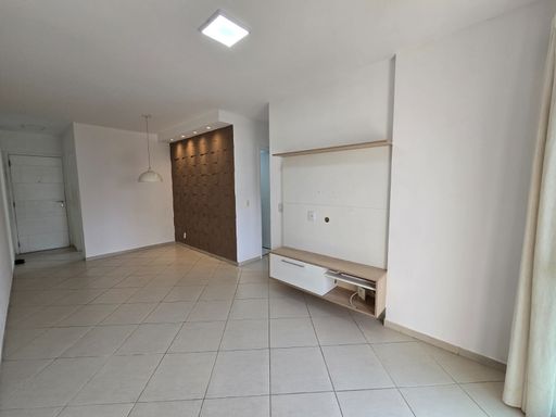 Sala ampla em dois ambientes com varanda, cozinha em conceito aberto com área de serviço, banheiro social e três quartos, sendo duas suítes