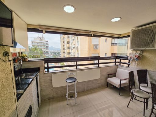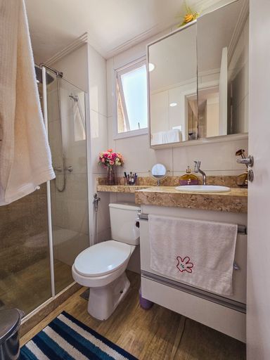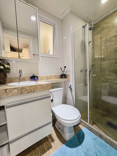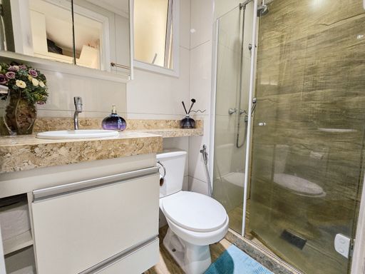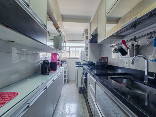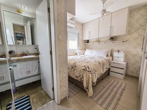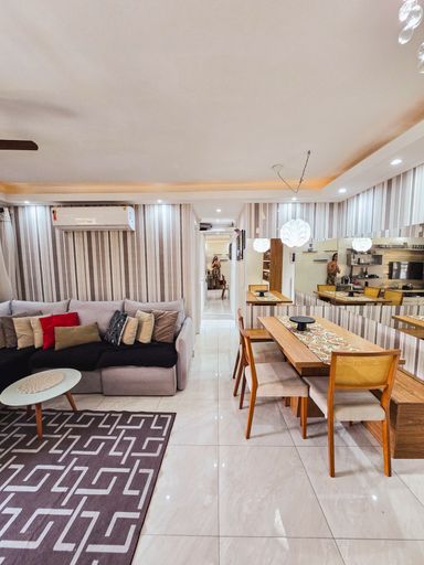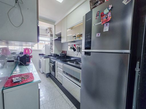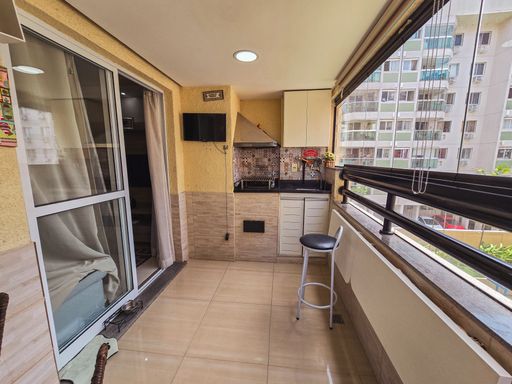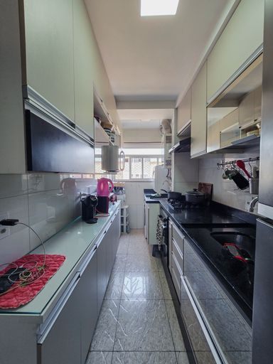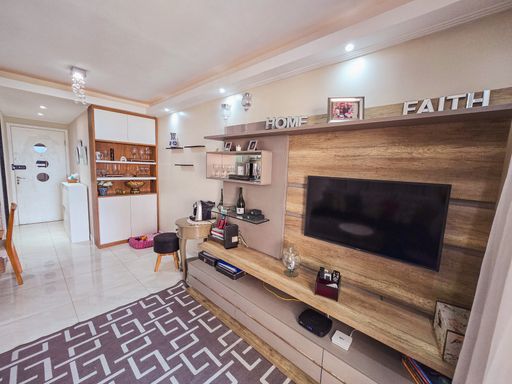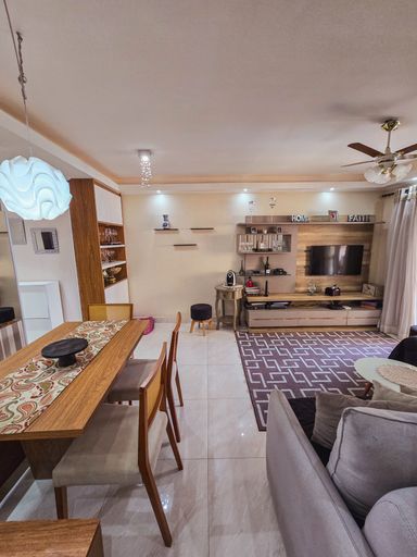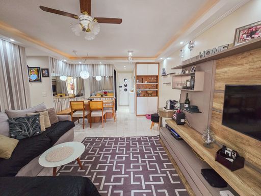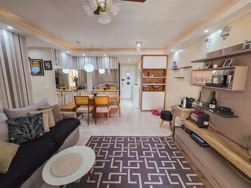 Sala ampliada em dois ambientes, varanda, cozinha com área de serviço, banheiro, escritório e dois quartos, sendo uma suite.