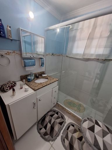 * Banheiro social amplo com Blindex e armários.