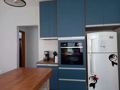 Móveis planejados na cozinha e nos banheiros, piscina e deck com área de 60m2.