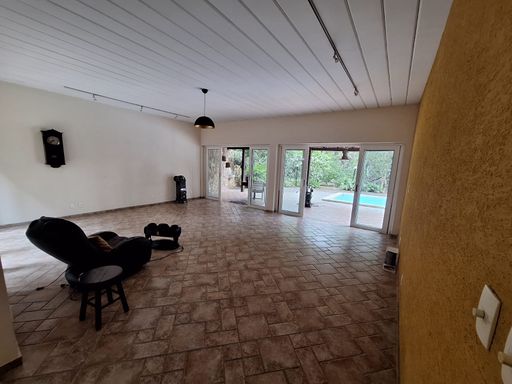 * Nível Térreo: hall social com pé direito alto, ampla sala com integração para o verde, lavabo, dois quartos com banheiro social e possibilidade de suíte, cozinha em dois ambientes com despensa, copa , área de serviço e dependências completas. Vasta área externa com piscina, churrasqueira, espaço fitness.