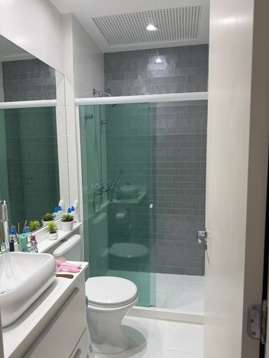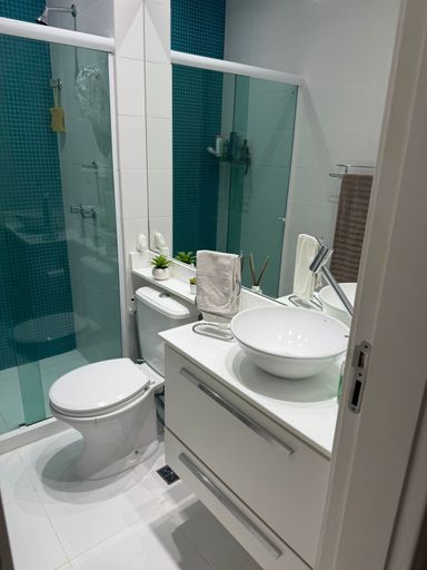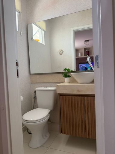 Banheiros com móveis Planejados, espelhos e box blindex, assim como o lavabo no piso térreo.