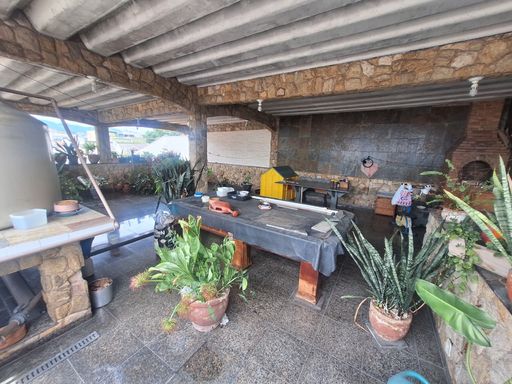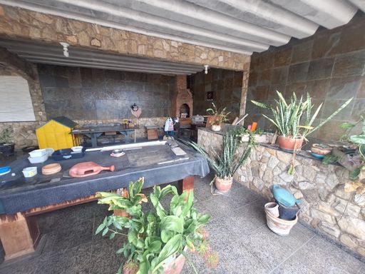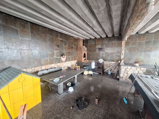 Terraço muito amplo com uma churrasqueira e totalmente coberto.