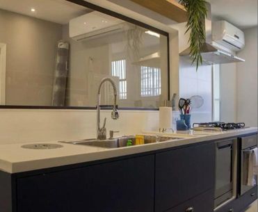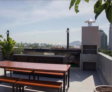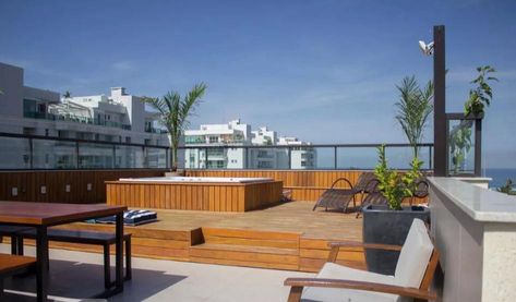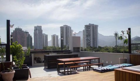 * Área gourmet com vista deslumbrante para o mar e a Pedra da Gávea, equipada com churrasqueira, deck e banheira hidromassagem para até 7 pessoas, perfeita para receber amigos e relaxar com conforto e sofisticação.