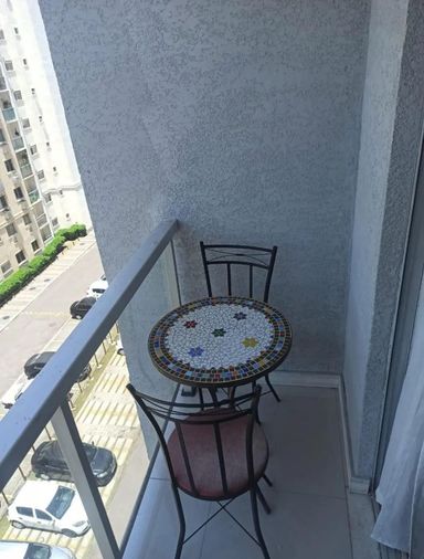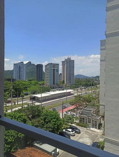 2 quartos (ambos com ar split) + banheiro social, sala, cozinha, e varanda com vista lateral pra Salvador Allende.