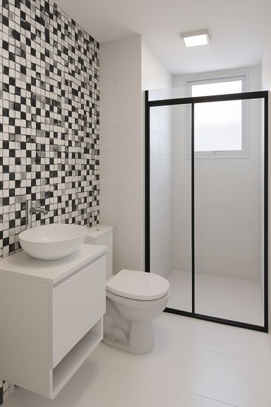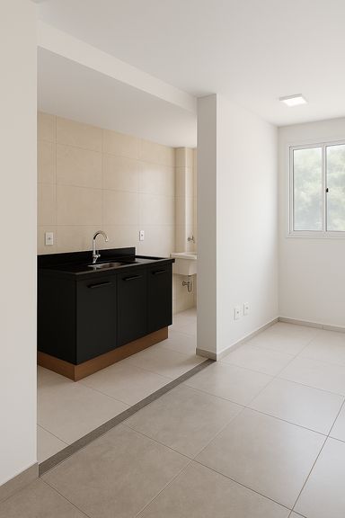 Cozinha com área de serviço integrada, Banheiro social moderno e funcional.