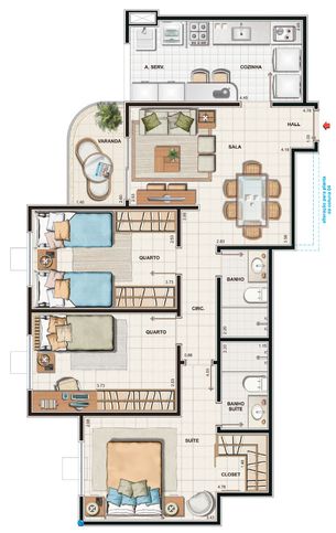 Espetacular 3 quartos, sendo 1 suíte, sala em 2 ambientes e banheiro social, cozinha com área de serviço.