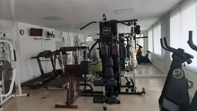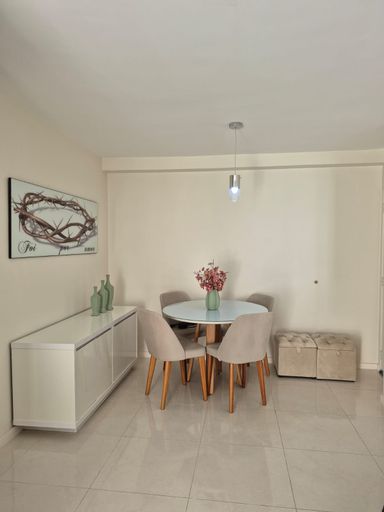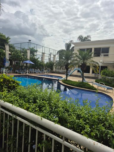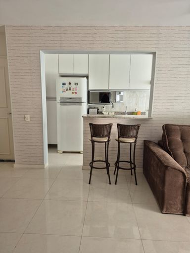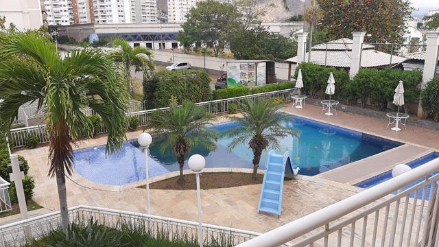 Sala ampla, varanda, sol da manhã, vista para piscina, três quartos, sendo 01 suíte, 2 banheiros( 1 social e outro suíte) com blindex e armários. Cozinha americana com armários planejados e área de serviço.
