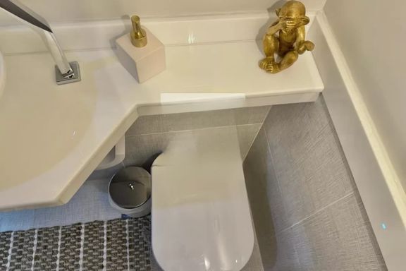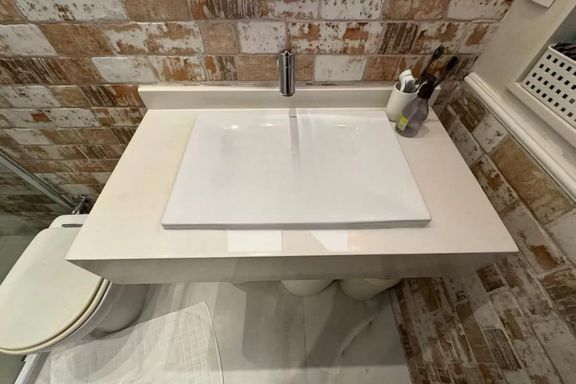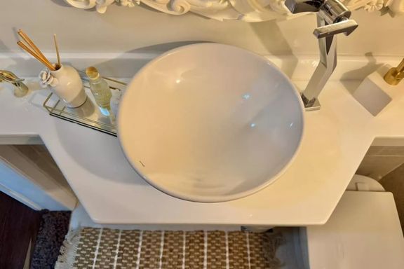 Lavabo decorado. Ótima galeria de circulação em l com armários roupeiros.