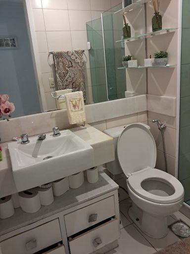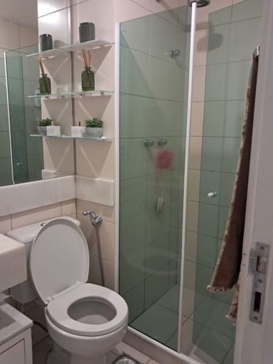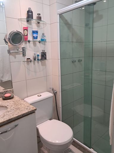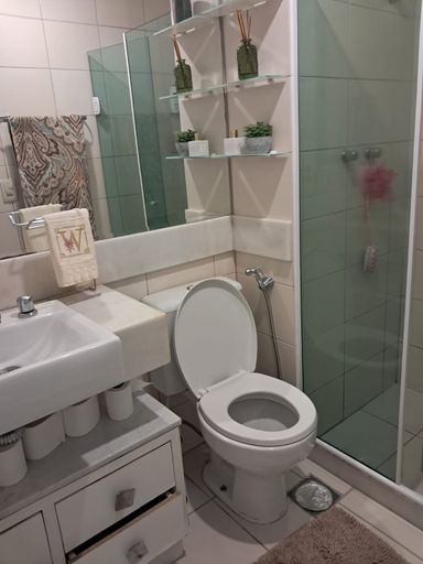 Banheiro com box blindex e armários.